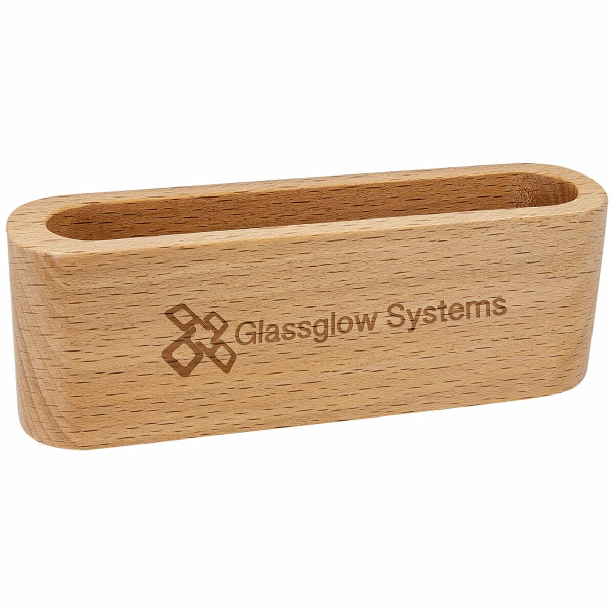 Business Card Holders are a great desk piece. They come in 2 styles- the Business Card Holder or Business Card and Pen Holder. They are available in Beech and Walnut. They are easily customizable by laser engraving.